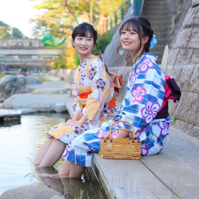 川沿いには様々なお店が面しており、散歩をしながら楽しめます。歩道から川に下りると無料の足湯もあり、
